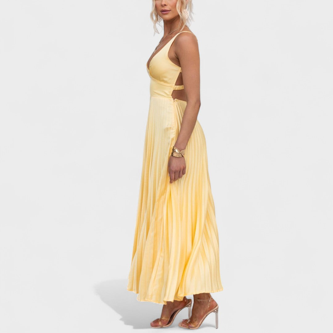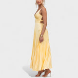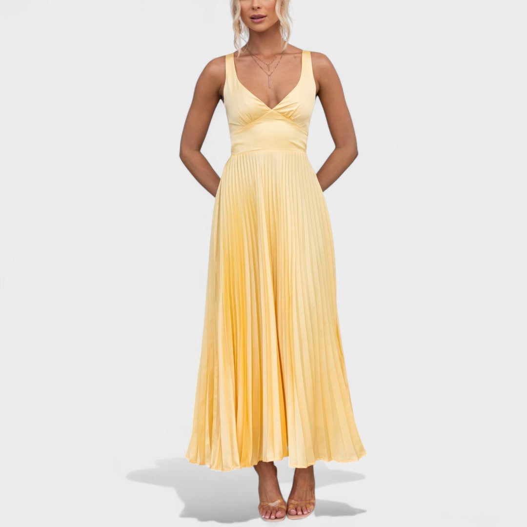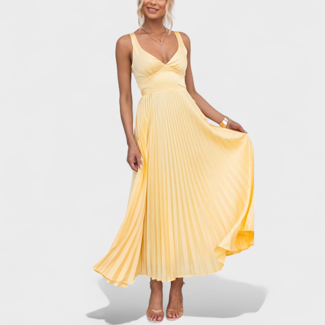Este deslumbrante vestido amarelo plissado é a escolha ideal para quem quer destacar-se com charme e sofisticação. Com um corte fluido e um decote cruzado que valoriza a silhueta, é perfeito tanto para eventos especiais como para um jantar ao pôr do sol. A leveza do tecido e o movimento das pregas criam uma sensação etérea que não passa despercebida.