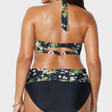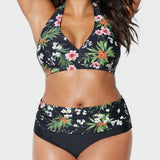 Este biquíni de padrão floral traz um toque exótico e sofisticado aos teus dias de verão. O top com decote halter oferece excelente suporte e modela o busto de forma natural, enquanto a cueca de cintura subida com detalhes drapeados ajuda a definir a silhueta com conforto e confiança.