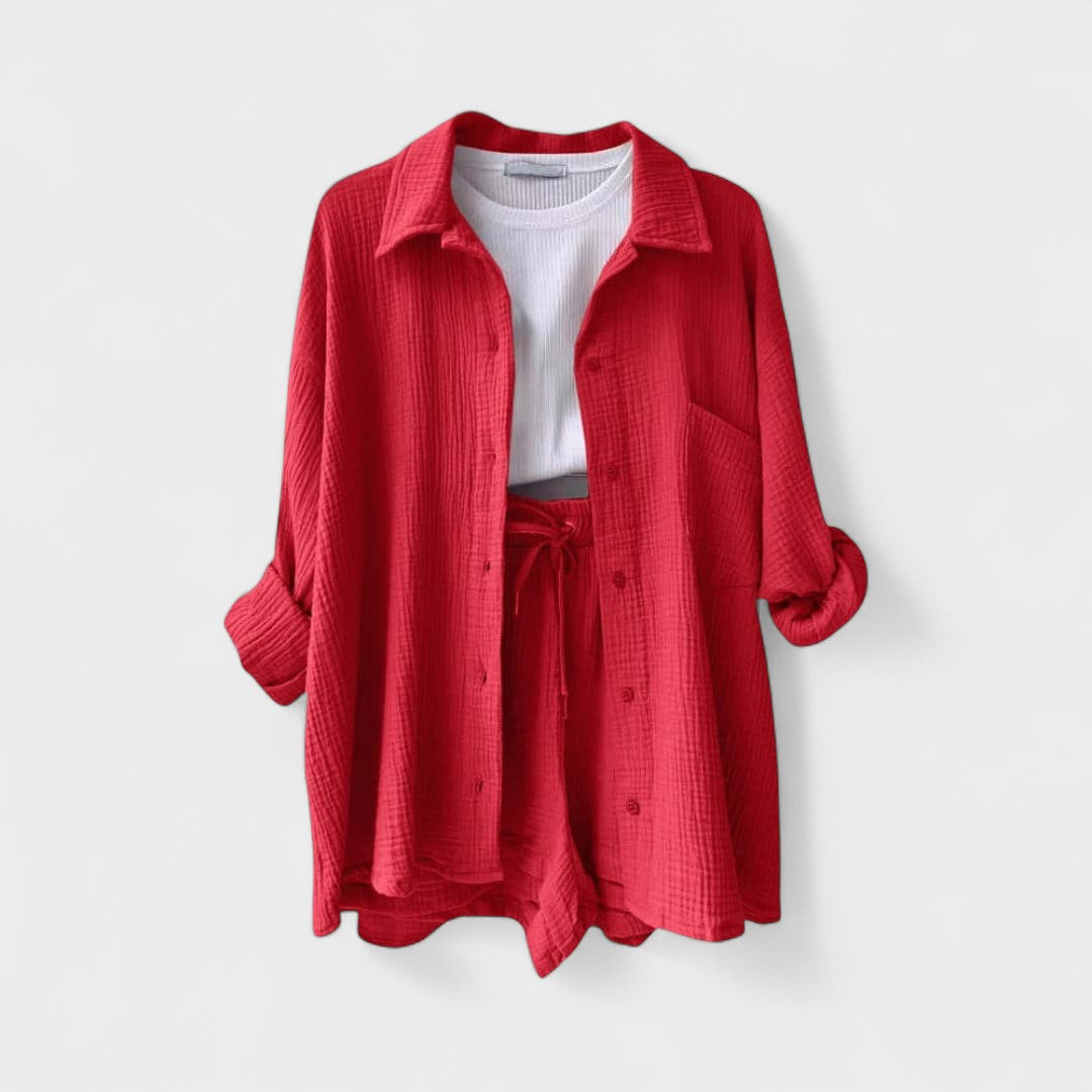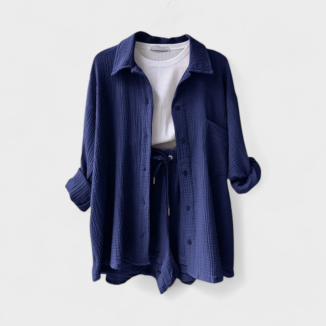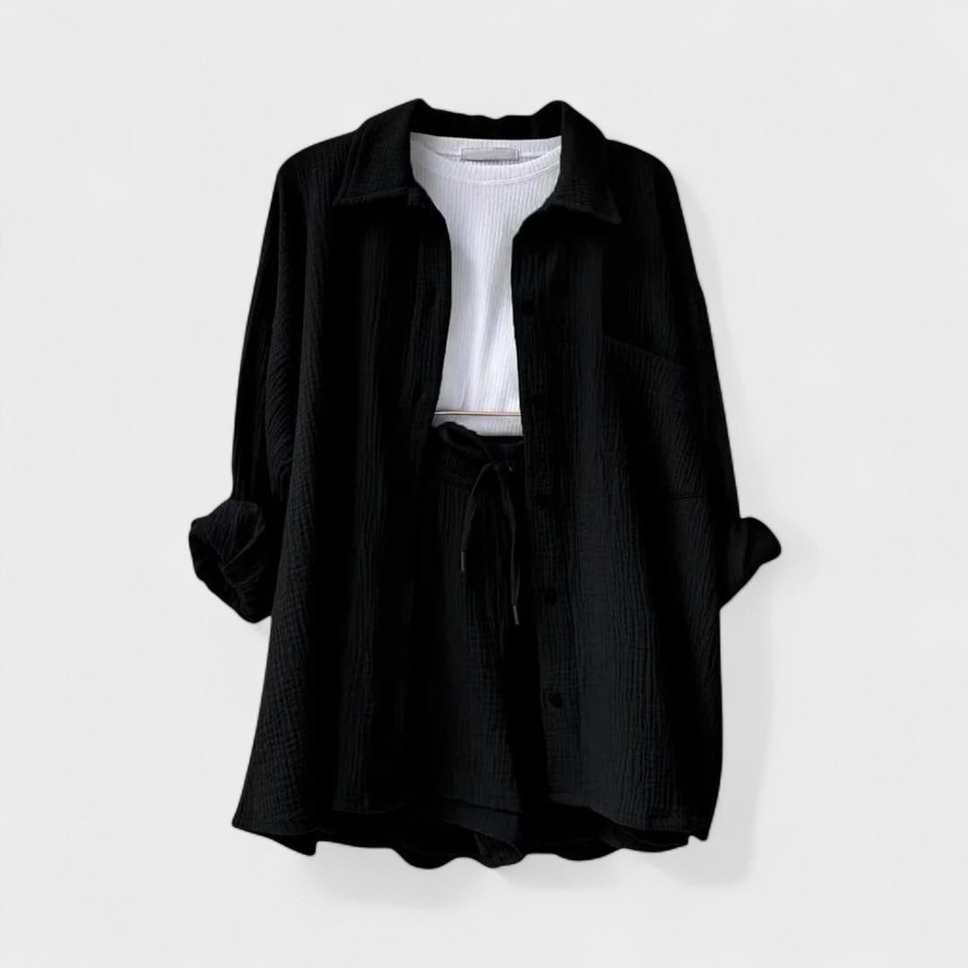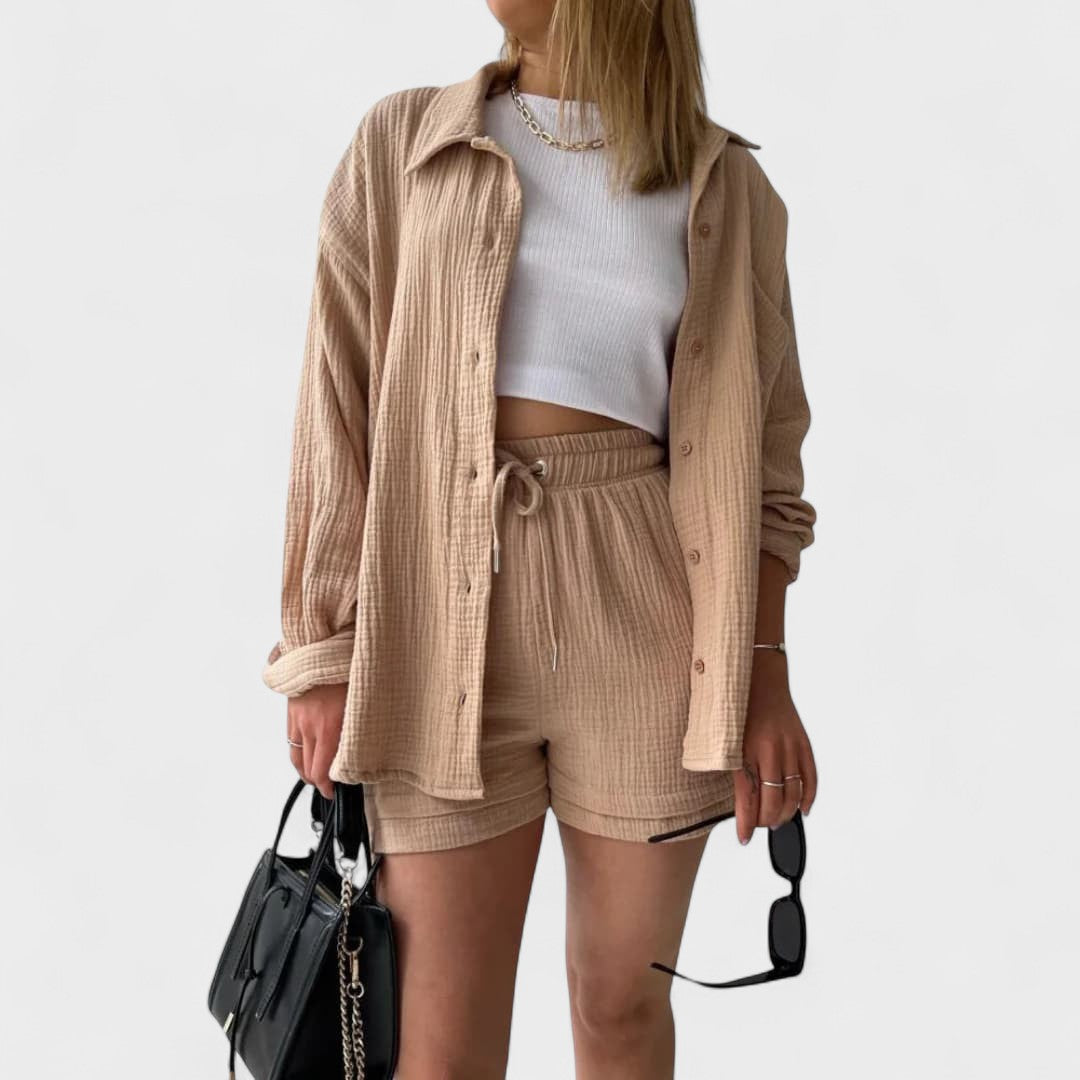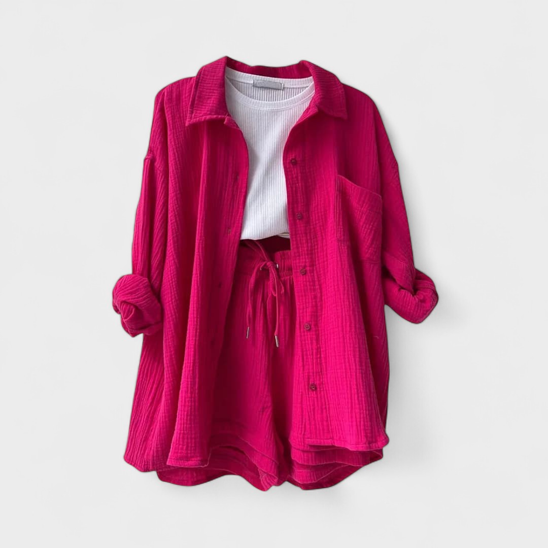 Este conjunto casual em tecido gaze de algodão é a definição perfeita de conforto moderno. Composto por camisa oversized, calções com cintura ajustável e uma t-shirt básica, o conjunto combina suavidade ao toque com uma estética minimalista e versátil. Ideal para relaxar com estilo ou para um passeio descontraído, adapta-se facilmente a várias ocasiões, mantendo sempre o visual cuidado e atual.